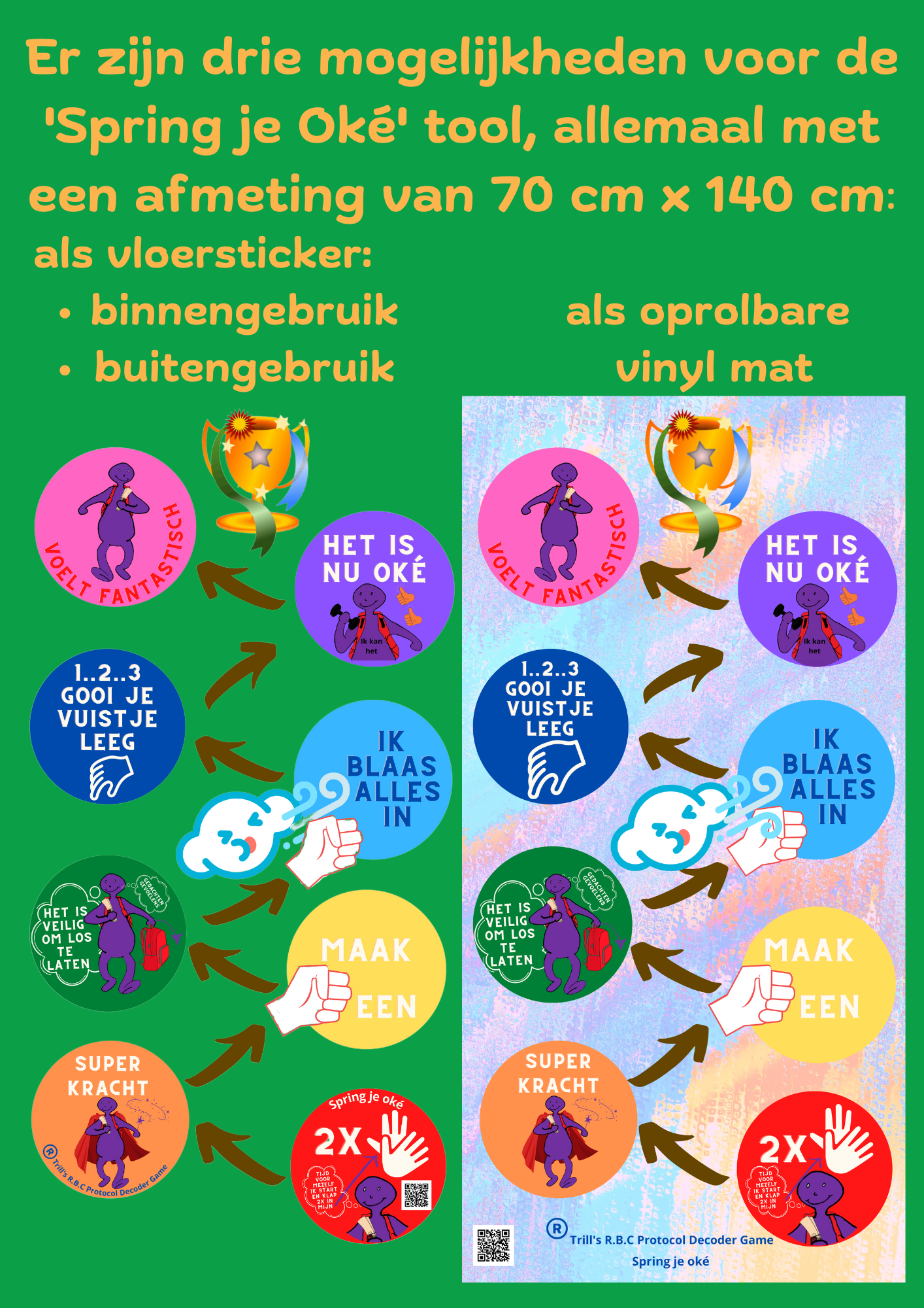 Toepassing: "De 'Spring je Oké' mat maakt buitenschoolse activiteiten niet alleen leuk maar ook leerzaam, door kinderen actief te laten werken aan hun emotionele veerkracht en motorische vaardigheden, terwijl ze hun lichamelijke en mentale gezondheid verbeteren.